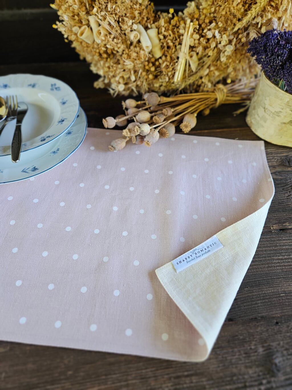 Prírodný ľan s bielymi bodkami a púdrovo ružová strana – jemnosť a hravosť v jednom kúsku.