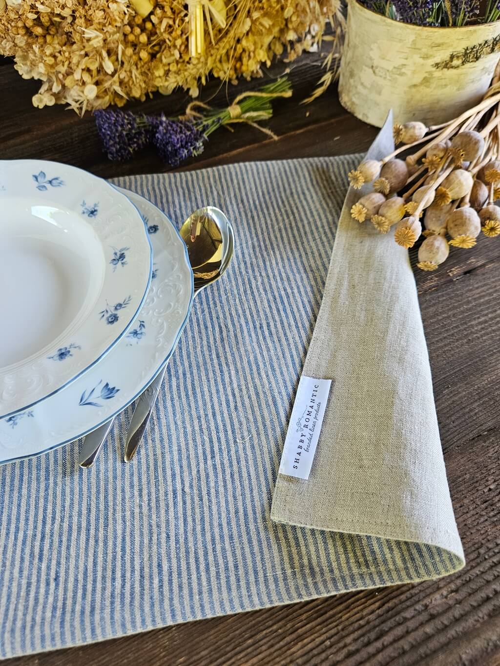 Prúžky v natur a modrej farbe dopĺňa čistá ľanová strana. Klasická a nadčasová kombinácia pre svieži, no jemný vzhľad stola.