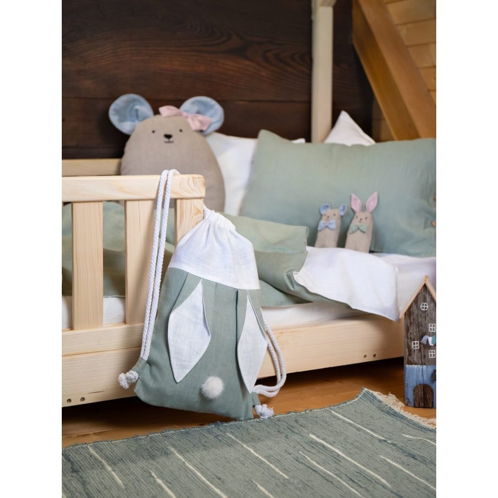 Celý set krásne dopĺňa ľanový ruksak so zajačími uškami a chvostíkom, do ktorého môžete obliečky jednoducho vložiť.