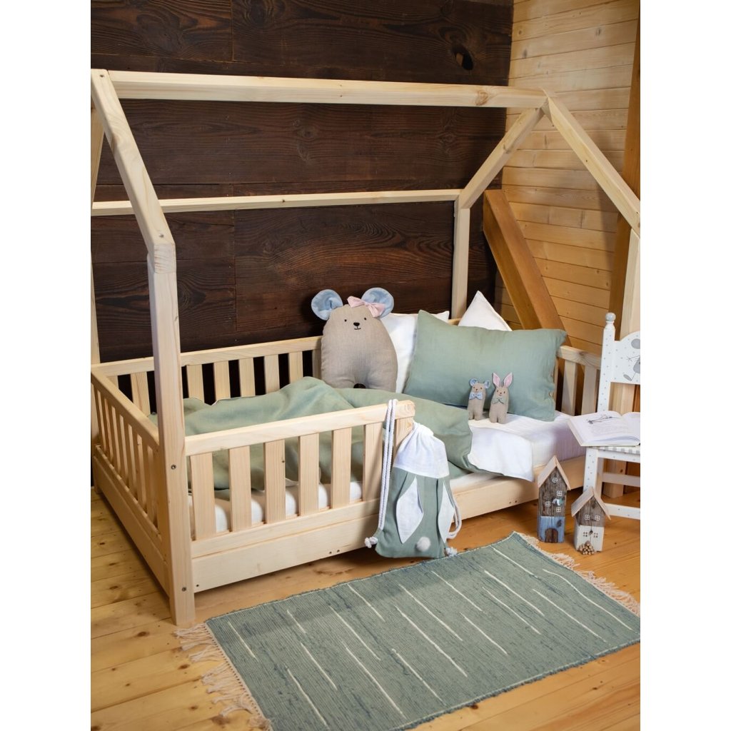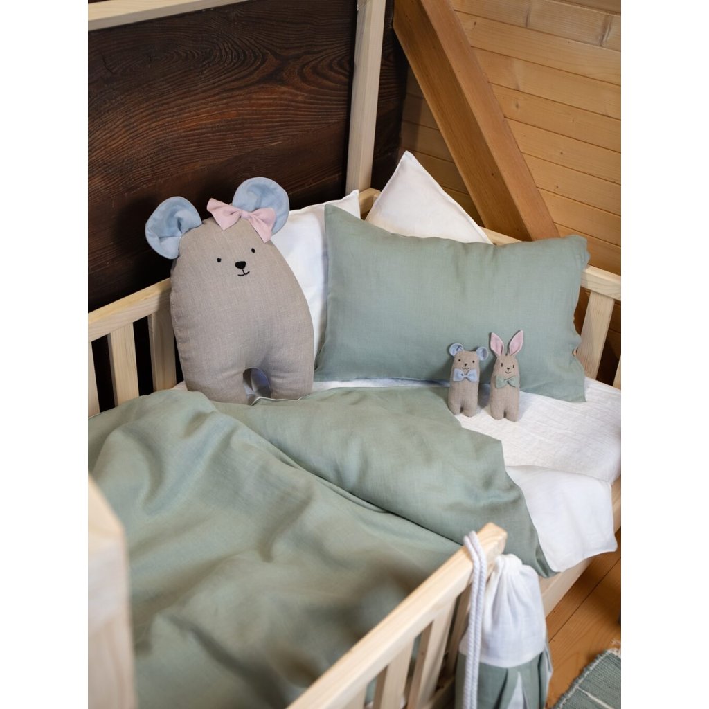 V postieľke ich dopĺňa veľká ľanová myška, ktorá slúži ako mäkká hračka aj ako dekoračný vankúš.