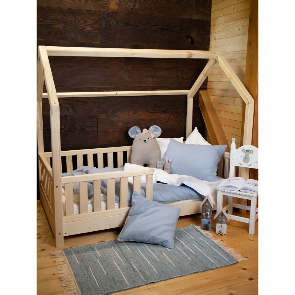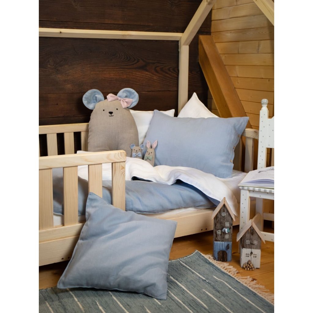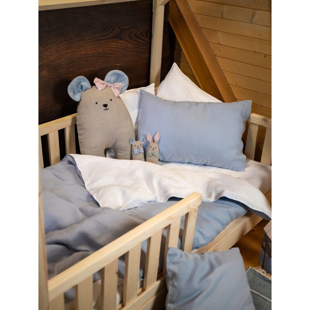 V postieľke ich dopĺňa veľká ľanová myška, ktorá slúži ako mäkká hračka aj ako dekoračný vankúš.