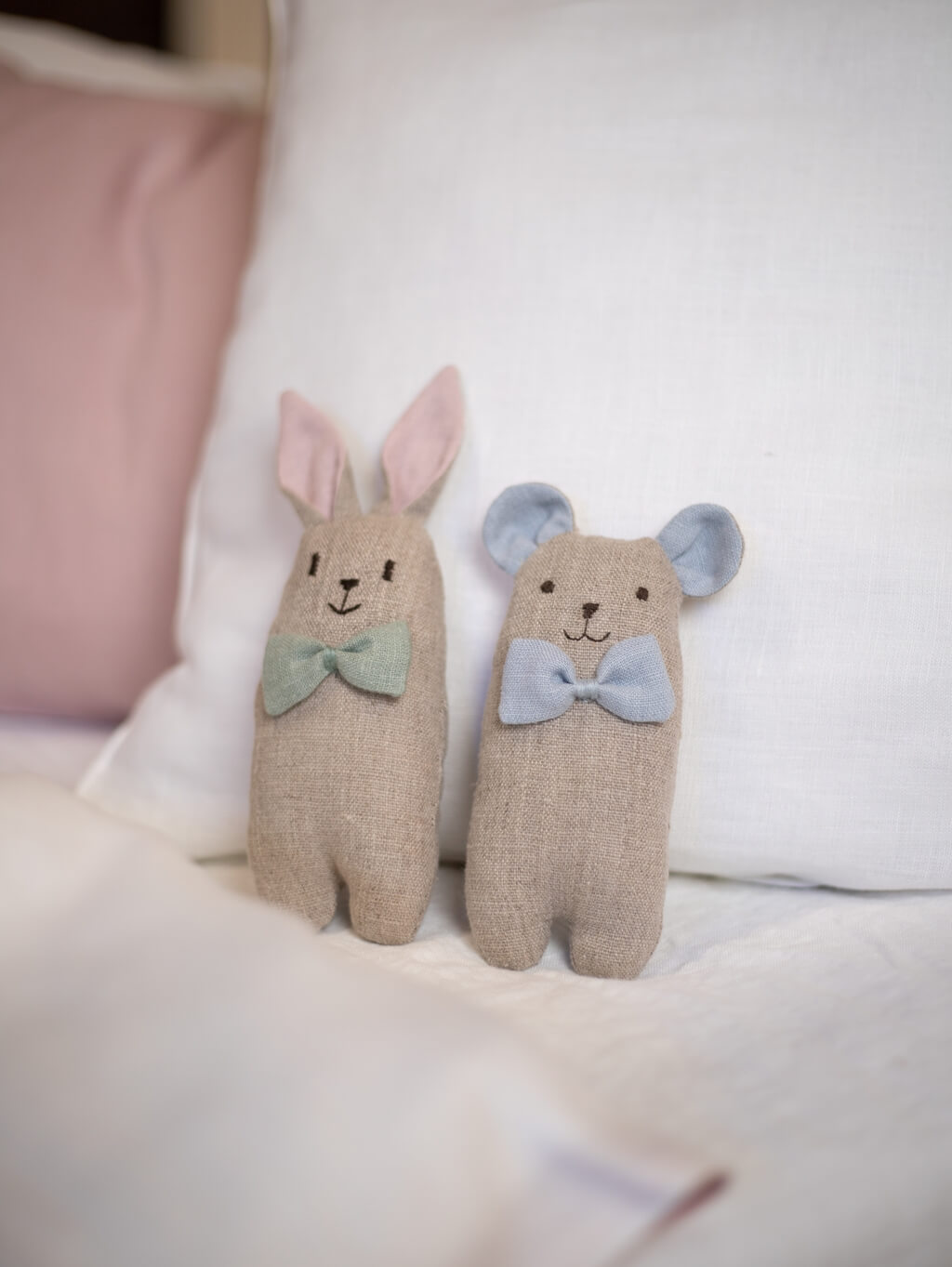 V lese, kde každý pohyb lístka rozpráva príbehy, žijú myška, macko a zajko – pripravení sprevádzať deti hrou aj spánkom. Všetky produkty sú ušité z jemného prírodného ľanu, doplnené ručne vyšívanými tváričkami a farebnými mašličkami, aby prinášali do detskej izbičky pokoj, bezpečie a rozprávkovú atmosféru. Šepot lesa – tichí strážcovia detských snov. |