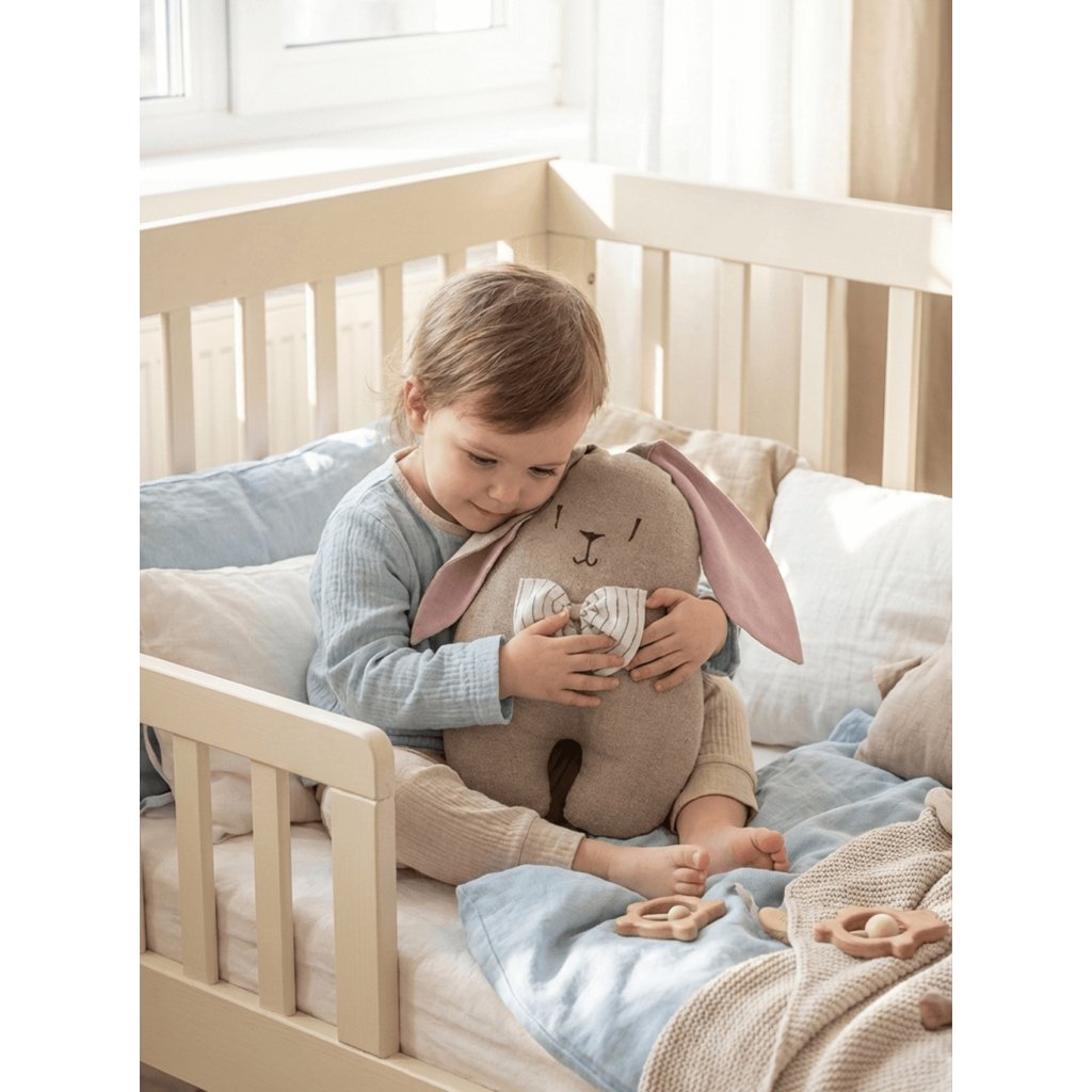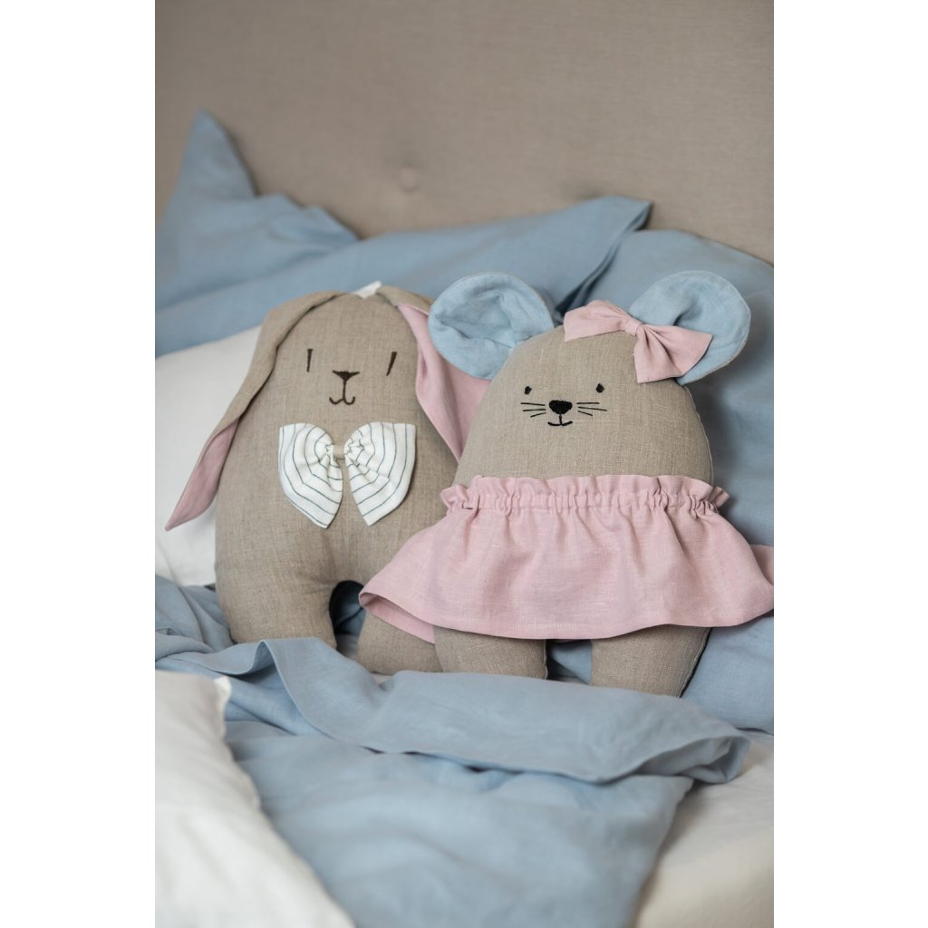 Má telíčko z prírodného ľanu, ručne vyšitú tváričku a jemnú mašľu. Jeho dlhé ušká akoby počúvali každý detský šepot a malý biely chvostík mu dodáva hravý pôvab.