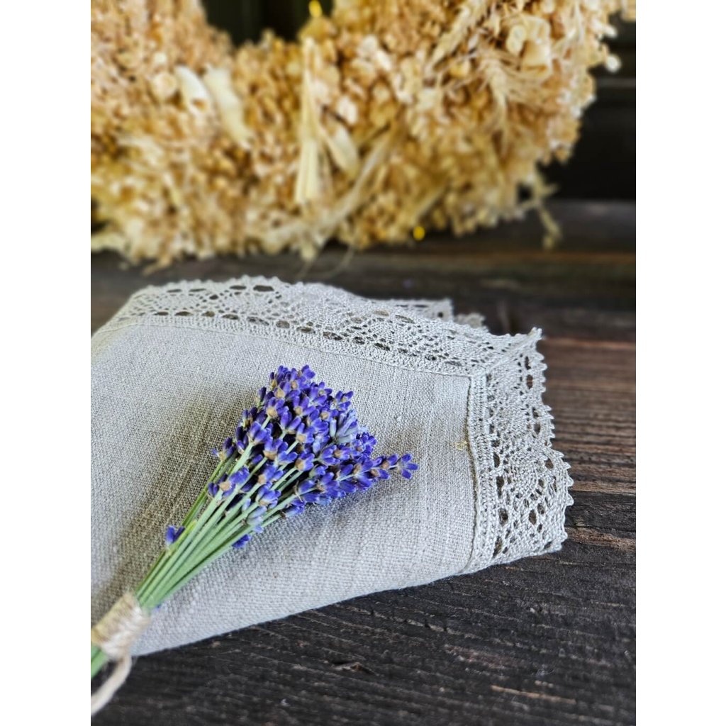 Použitý je 100% ľan v natur farbe. Obrúsok je doplnený o vkusnú paličkovanú krajku.