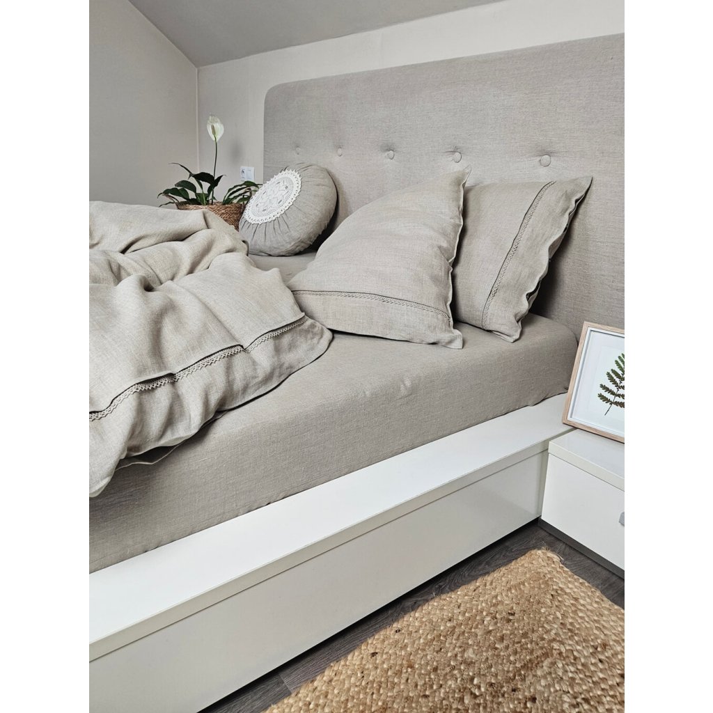 Zvolili sme jemnú ľanovú krajku a precízne ušili úzky sklad, ktorý ju nežne prekrýva.