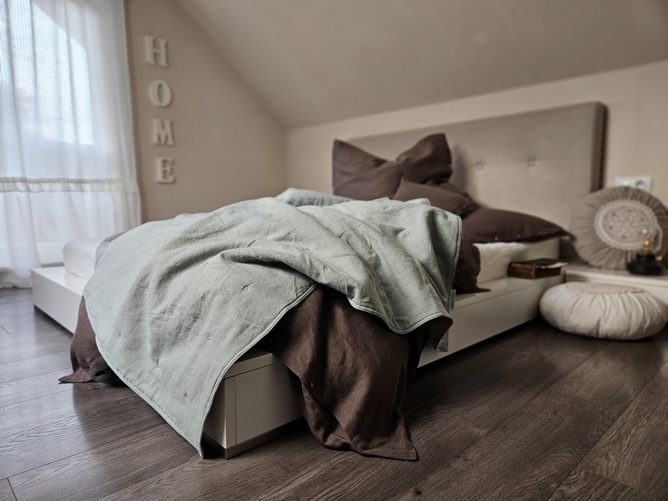 Ľanová prikrývka Frosty Green pre chvíle sladkého leňošenia.