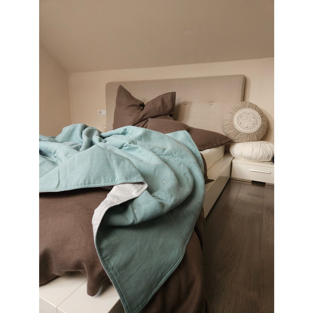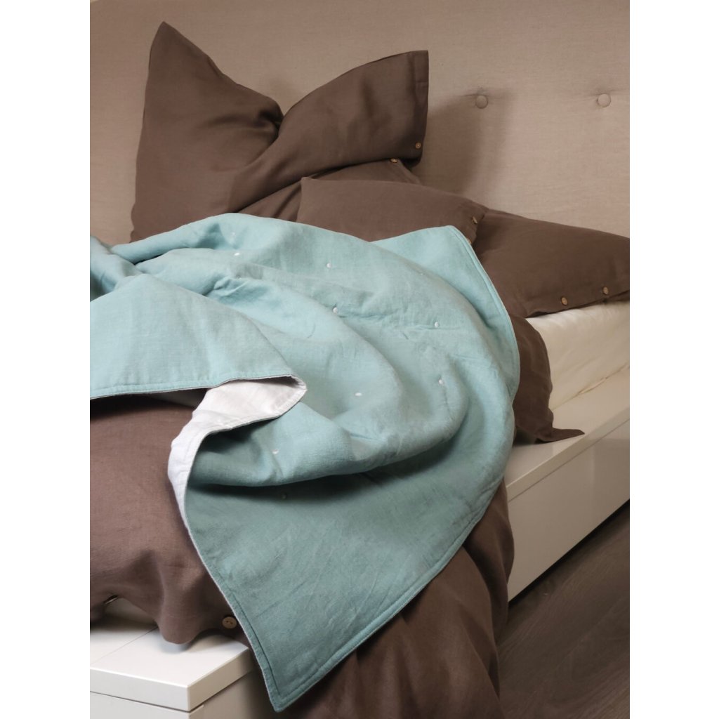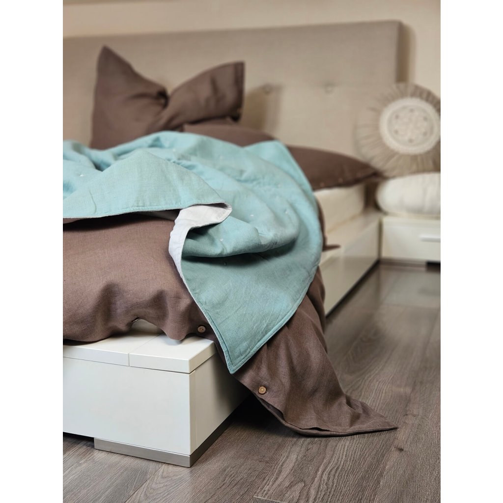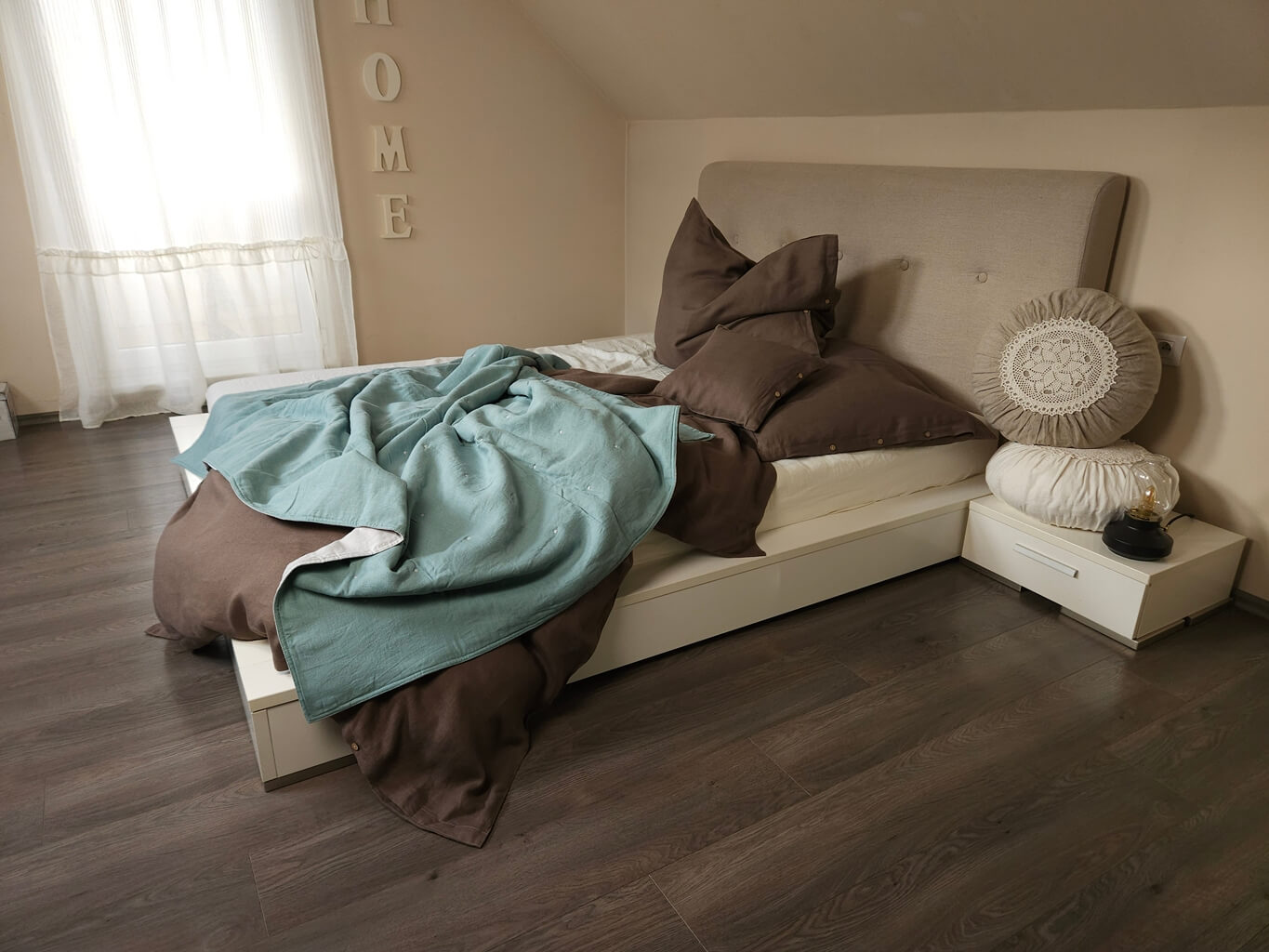 Ľanová prikrývka Frosty Green je vyrobená z dvoch vrstiev ľanu, medzi ktoré sme vložili hrejivý, bavlnený vatelín.