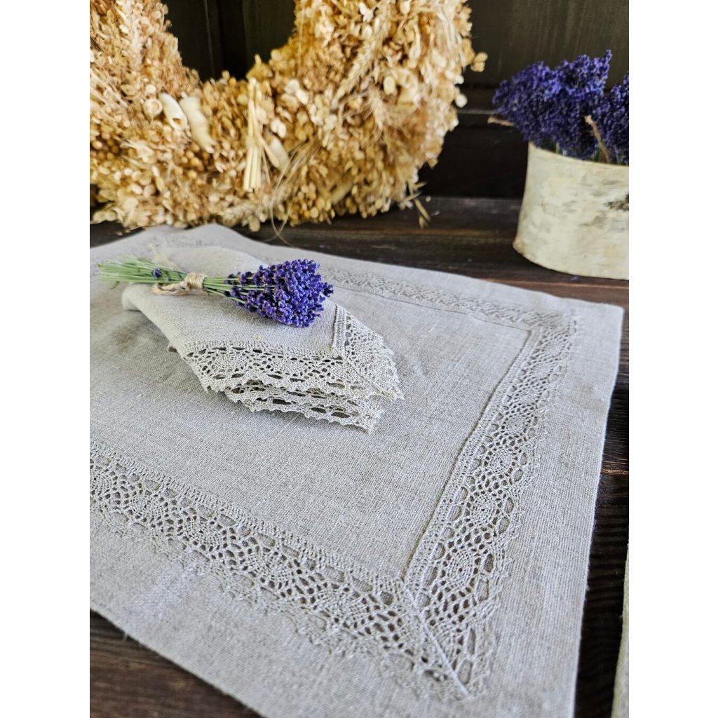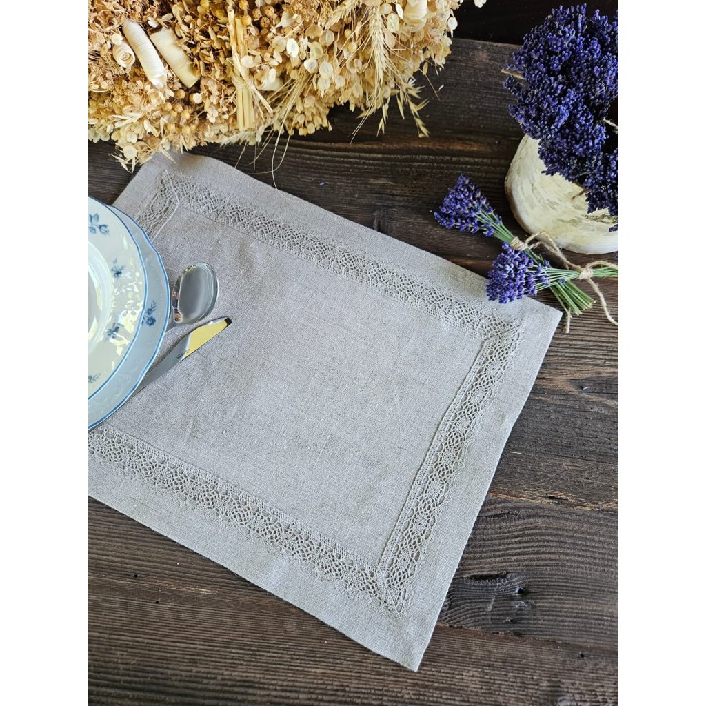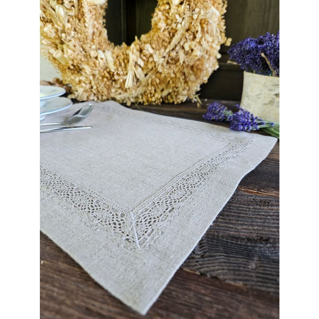Použitý 100% ľan vo farbe natur - režná. Prestieranie je doplnené o vkusnú paličkovanú krajku.