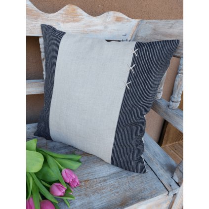 Ľanová vidiecka obliečka na vankúš s červeným prúžkom.
