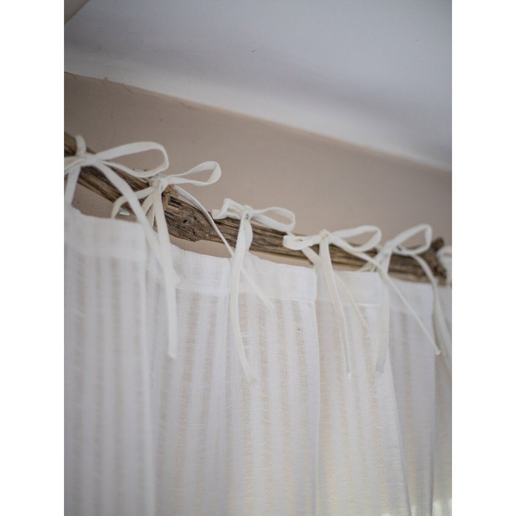 Je ušitá z dvoch materiálov. Hladká časť záclony s prúžkom je ľanovo bavlnená.